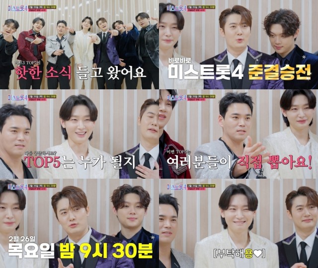 '미스터트롯3' TOP7은 김용빈, 손빈아, 천록담, 춘길, 최재명, 남승민, 추혁진으로 구성되어 있으며, 이들은 1년 전 같은 무대에 서며 쌓은 경험을 바탕으로 '미스트롯4'의 준결승전을 응원하고 있다. 김용빈은 "문자 많이 보내주실 거죠?"라는 발언으로 시청자들의 관심을 끌었다.