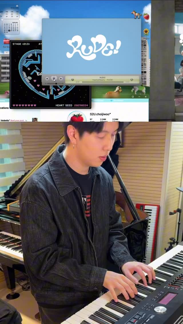 김요한은 최근 자신의 SNS에 'RUDE! (YOHAN KIM Ver.)'라는 제목의 트리뷰트 콘텐츠를 올리며 하츠투하츠의 인기 신곡 'RUDE!'에 대한 애정을 드러냈다. 영상 속에서 김요한은 검은색 재킷과 흰색 티셔츠 차림으로 피아노 연주에 집중하는 모습이 담겨 눈길을 끌었다. 음악 스튜디오를 배경으로 한 그의 모습은 진지하면서도 섬세한 감성이 느껴진다.