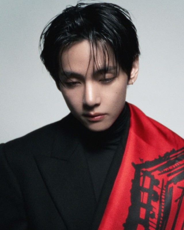공개된 이미지에서는 뷔가 회색 외투와 검은색 셔츠, 체크 무늬 넥타이를 착용한 모습이 포착됐다. 몸을 살짝 앞으로 기울인 채 정면을 응시하며 입을 다문 표정에서 고급스러운 분위기가 물씬 풍겼다. 또한 검은색 상의에 빨간색 스카프를 매치한 컷에서는 스카프를 살짝 들거나 얼굴 일부를 가리는 등 다양한 포즈로 독보적인 아우라를 자아냈다.