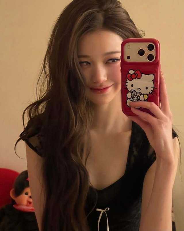 장원영이 최근 자신의 SNS에 검은색 상의를 입고 거울 셀카를 올리며 청량한 미소를 드러냈다. 긴 머리를 자연스럽게 늘어뜨린 모습으로, 헬로키티 캐릭터가 그려진 스마트폰 케이스가 눈길을 끈다. 배경에는 단색 벽과 함께 인형이 놓여 있어 아기자기한 분위기를 더했다.
