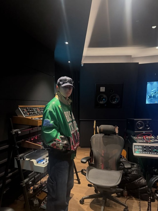민규는 녹색 자켓을 입고 몸을 앞으로 숙인 채 셀카를 찍으며 팬들과 가깝게 소통하는 모습도 보였다. 음악 장비 사이에서 스피커와 키보드가 함께 포착되어 그의 음악적 열정과 작업 중인 모습이 짐작됐다. 평소보다 한층 자유로운 스타일링과 자연스러운 표정으로 팬들의 기대를 모았다.