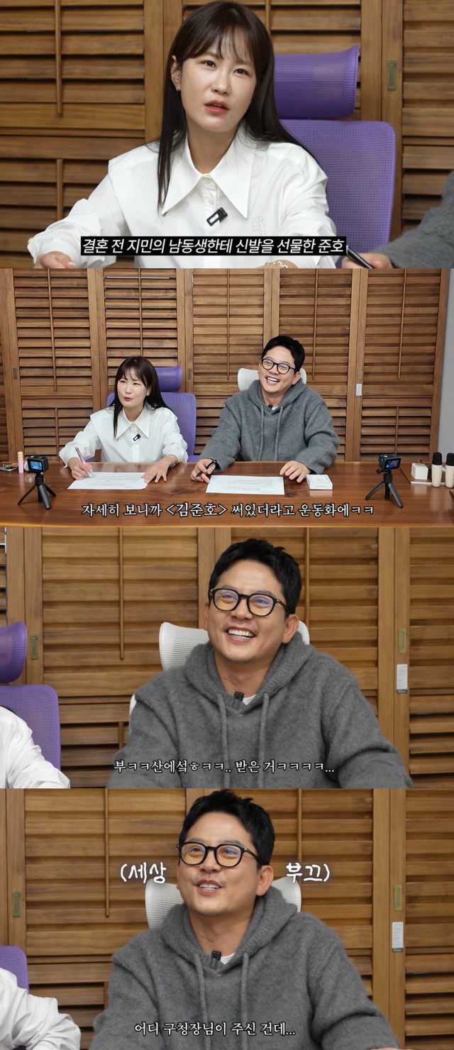 김지민이 "쓸모 있는 선물인데 그런 아기자기한 재미를 즐기시는 분이라 재밌다"고 하자, 김준호는 "우리 형처럼 할 자신 있으면 해도 된다"고 말했다. 이후 김준호가 "선물이라는 게 돌려 쓰면 다 티 난다"고 하자, 김지민은 "오빠가 결혼 전에 내 남동생에게 선물을 준 적 있다"며 비하인드를 공개했다. 김지민의 남동생은 "누나, 나 이거 못 신겠다"고 하며, 자세히 보니 선물에 '김준호' 이름이 적혀 있었다는 것이다. 김준호는 "부산에서 받은 거다. 어디 구청장님이 주신 건데 이름이 써 있는 줄 몰랐다"고 해명하며 "그래서 선물은 정성이 중요하다"고 덧붙여 웃음을 자아냈다.