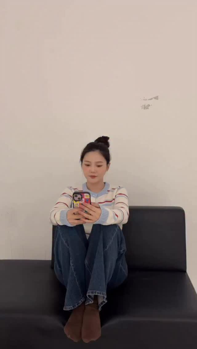 효정은 최근 인스타그램에 흰색과 파란색 줄무늬 스웨터에 청바지를 입고 검은색 소파에 앉아 있는 사진을 공개했다. 그녀는 스마트폰을 든 채 카메라를 정면으로 응시하며 편안한 일상을 담아냈다.