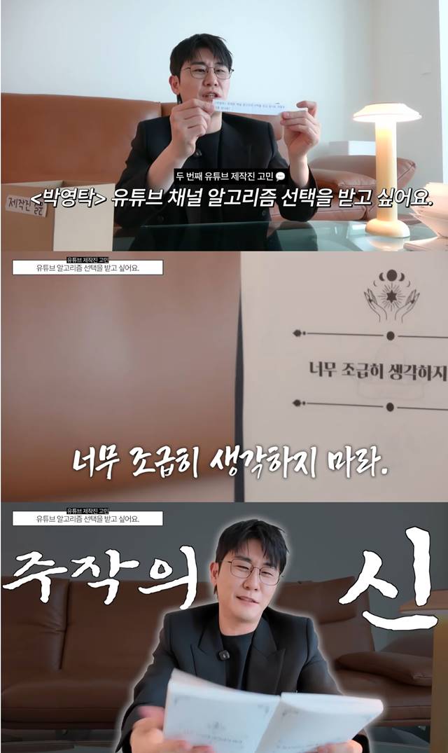 제작진은 “유튜브 알고리즘의 선택을 받고 싶은데 어떻게 해야 하나요?”라는 간절한 고민을 내놓았다. 이에 영탁이 펼친 해결책에는 “너무 조급히 생각하지 마라”라는 문구가 담겨 있었다.