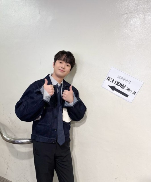 사진 속 이찬원은 댄디한 셔츠에 넥타이, 그리고 캐주얼한 데님 재킷을 매치해 스마트하면서도 훈훈한 'MC또'의 정석을 보여주었다. 벽면에 붙은 '토크 대기실 가는 길' 안내문 옆에서 포즈를 취한 그의 모습은 매주 명곡 무대를 소개하며 안방극장에 감동을 전하는 든든한 MC로서의 존재감을 다시 한번 확인시켜 준다.