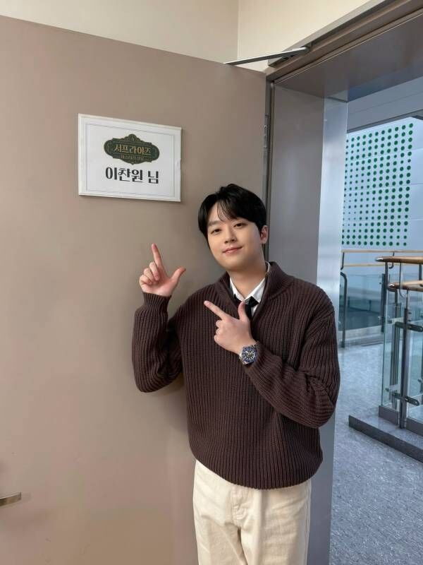 공개된 사진 속 이찬원은 자신의 이름이 적힌 대기실 문 앞에서 포즈를 취하고 있다. 그는 짙은 갈색 니트에 셔츠와 넥타이를 매치한 단정한 스타일을 선보였다. 이찬원은 한 손으로 이름표를 가리키고, 다른 손으로는 자신을 지목하며 귀여운 포즈를 취하고 있다. 이 모습은 팬들의 시선을 끌었다.