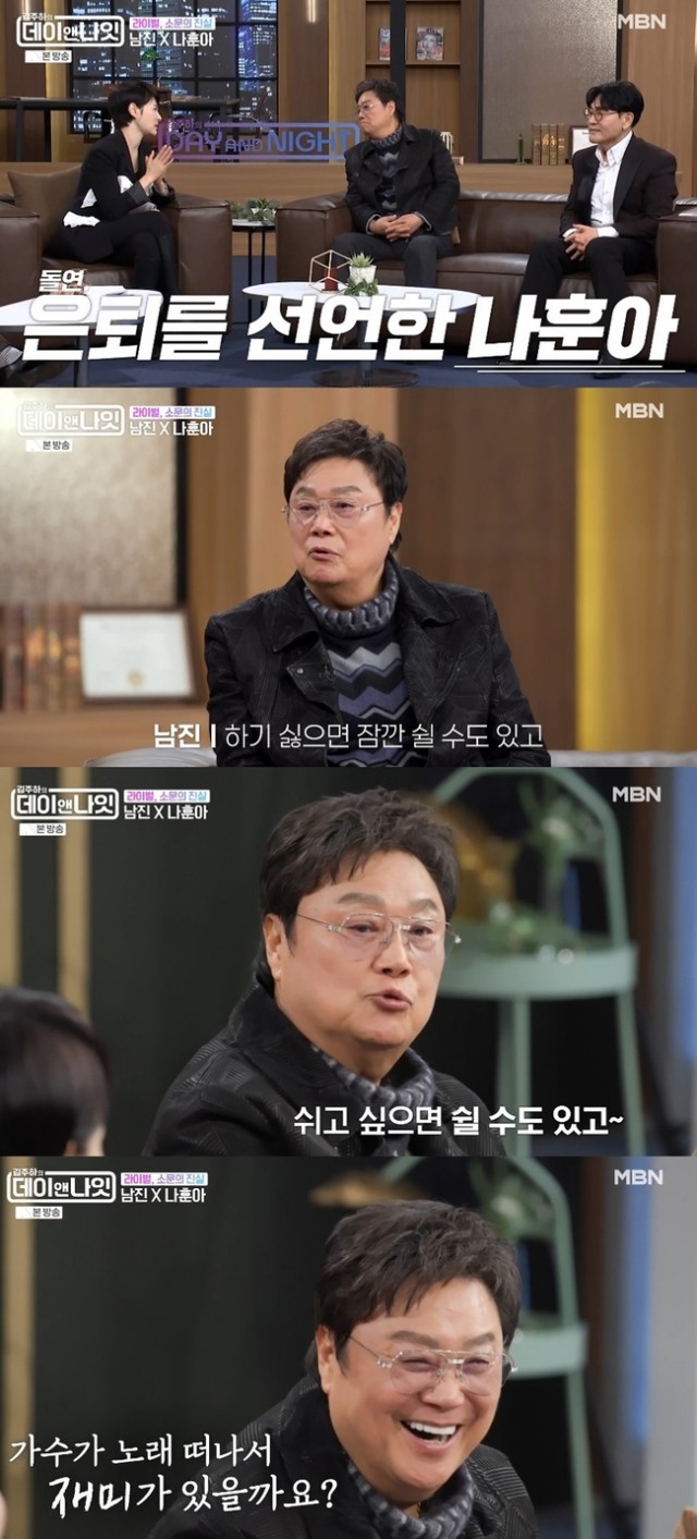 남진이 나훈아, 조용필과의 협업에 대한 의사를 밝혔다. 3월 21일 방송된 MBN '김주하의 데이앤나잇'에서는 남진과 조항조가 게스트로 출연했다. 남진은 나훈아와 조용필과 함께 무대를 해보고 싶다는 의견을 전했다. 그는 "나이가 들어 아쉬운 게 있다면 용필씨, 훈아씨 셋이 함께한 무대를 남겨두고 싶다"고 말했다. 이어 "세 사람이 한 시대를 이뤘으니 가요계에 좋은 기록이 될 것"이라고 덧붙였다.