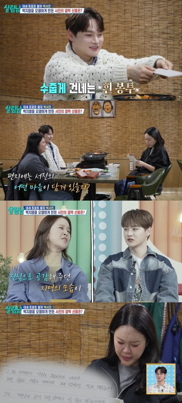 편지 내용에는 박서진이 백지영에게 느끼는 고마움이 담겨 있었다. 그는 "항상 누나에게 감사한 마음을 전하고 싶었는데, 이번이 기회인 것 같아"라고 적었다. 또한, "누나의 크고 따뜻한 리액션 덕분에 마음 편하게 즐기며 살림남 촬영을 할 수 있었다"는 내용도 포함되어 있었다. 백지영은 이 편지를 읽으며 눈물을 흘렸다.