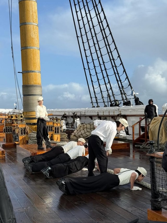BTS가 최근 공식 SNS를 통해 운동 중인 모습을 공개하며 팬들의 이목을 끌고 있다. 공개된 사진에서 멤버들은 흰색 셔츠와 검은색 바지를 착용한 채 배의 갑판 위에서 팔굽혀펴기를 하며 몸을 풀고 있는 모습이 담겼다. 망망대해를 배경으로 한 이 장면은 여행이나 촬영 일정 중 틈틈이 체력 관리를 하는 모습을 엿볼 수 있게 한다.