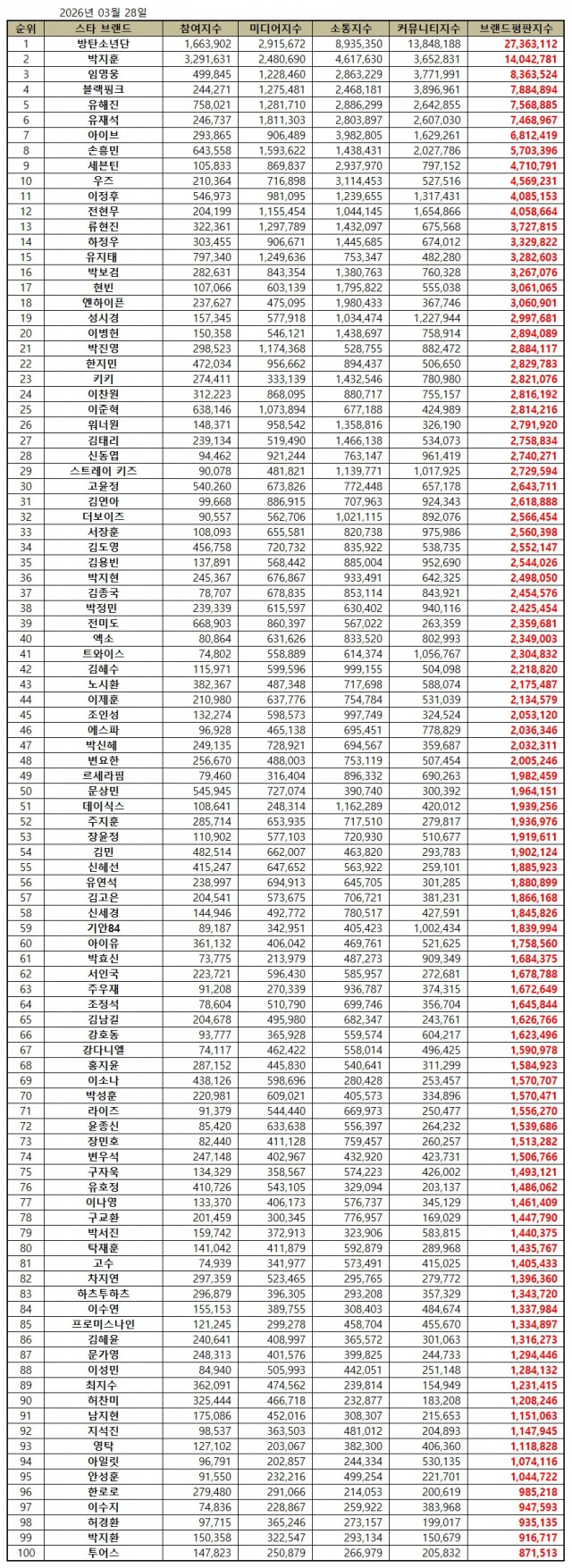 2026년 3월 스타 브랜드평판 조사에서 방탄소년단이 1위, 박지훈이 2위, 임영웅이 3위에 올랐다.
