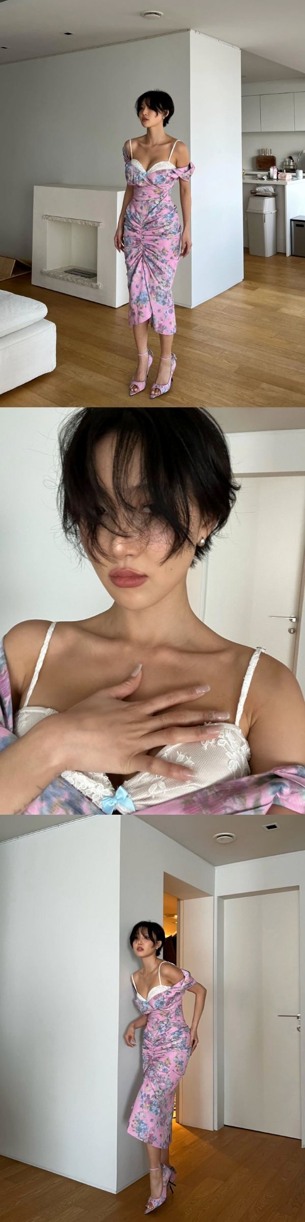 화사는 28일 인스타그램에 "Thank you"라는 글과 함께 여러 장의 사진을 게재했다. 사진 속 화사는 핑크색 꽃무늬 드레스를 화이트 레이스 브라톱과 레이어드해 오프숄더 스타일을 연출했다. 드레스는 셔링 디테일로 몸매 라인을 강조했으며, 같은 패턴의 스트랩 힐을 매치해 통일감을 더했다. 액세서리를 최소화해 전체적인 스타일의 세련미가 부각됐다. 짧은 숏컷 헤어스타일은 화려한 의상과 대조를 이루며 시크한 분위기를 자아냈다. 사진은 일상적인 공간에서 촬영됐으나, 몽환적이고 드라마틱한 매력이 느껴진다는 평가도 나왔다.