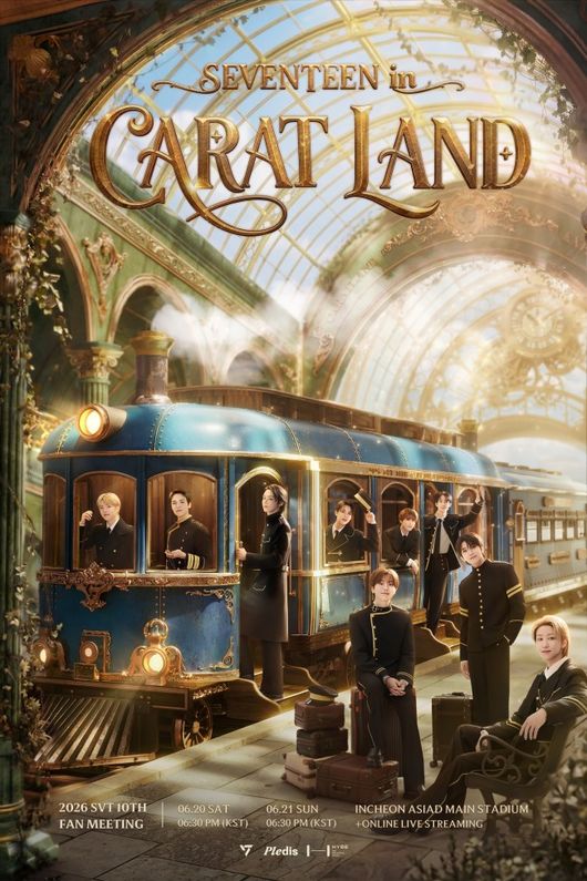 공개된 포스터에는 세븐틴 멤버들이 기장으로 변신해 열차에 탑승할 팬덤 '캐럿'을 기다리는 모습을 담았다. 멤버들은 밝은 표정으로 카메라를 바라보고 있다.