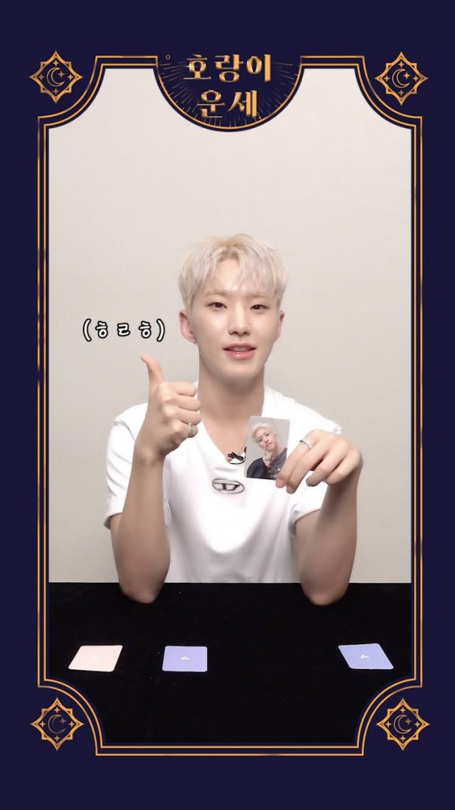 세븐틴의 호시가 최근 자신의 SNS를 통해 '호랑이 운세 5' 카드를 공개하며 팬들과 소통에 나섰다. 공개된 사진 속 호시는 흰색 반팔 티셔츠를 입고 단색 배경 앞에서 미소를 띤 채 한 손으로 엄지손가락을 들어올린 포즈를 취하고 있다. 옆에 놓인 카드와 함께 금발 머리가 인상적인 모습이다.