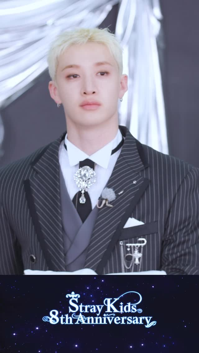 스트레이 키즈 공식 SNS 계정에는 멤버 방찬이 등장한 이미지와 함께 '??8️⃣ #StrayKids #스트레이키즈 #방찬 #StrayKids8thAnniversary #YouMakeStrayKidsStay'라는 문구가 게시됐다. 금발 머리에 검정색 줄무늬 정장을 입은 방찬은 단색 배경과 장식이 있는 공간에서 정면을 응시하며 차분한 표정을 짓고 있다.