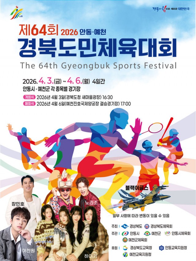 이번 경북도민체육대회는 4월 3일부터 6일까지 안동시와 예천군에서 공동 개최된다. 두 지역이 함께 대회를 여는 것은 이번이 처음이다. 개회식은 대회 첫날 경북도청 새마을광장에서 진행되며, 오프닝 공연을 비롯해 선수단 입장, 축사, 선서, 성화 점화 등의 공식 순서가 마련된다. 개회식 이후에는 이찬원을 비롯해 노라조, 장민호, 하이키 등 다양한 아티스트들이 축하 공연을 펼친다.