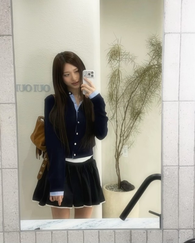 최근 이서는 네이비색 상의와 검은색 스커트를 매치한 깔끔하면서도 세련된 룩으로 눈길을 끌었다. 단순한 흰색 벽과 선반이 있는 실내에서 촬영된 사진 속 이서는 한 손으로 긴 머리를 자연스럽게 만지며 우아한 분위기를 자아냈다. 고개를 약간 돌린 채 정면을 바라보는 모습과 미소 띤 표정이 조화를 이루며 청순하면서도 성숙한 매력을 발산했다.