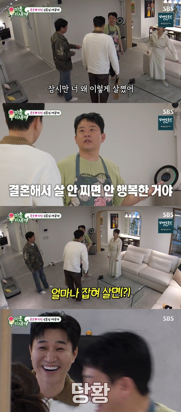 SBS '미운 우리 새끼'에서 김준호와 김지민 부부의 신혼생활이 공개됐다. 이날 방송에서는 임원희와 김종민이 신혼집을 방문해 김준호의 달라진 외모에 주목했다. 두 사람은 김준호를 보며 "왜 이렇게 살이 쪘냐"며 놀라움을 드러냈다.
