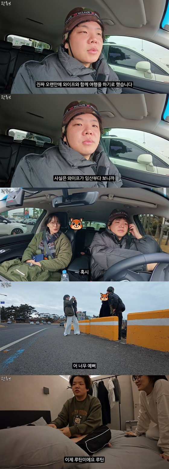 곽튜브는 지난 7일 개인 유튜브 채널에 '의외로 로맨틱한 만삭 여행 브이로그'라는 제목의 영상을 게재했다. 이번 여행은 곽튜브가 아내의 출산을 앞두고 준비한 것으로, 제주도에서 주말을 보내는 모습이 담겼다. 곽튜브는 "진짜 오랜만에 와이프와 함께 여행을 가기로 했다. 와이프가 임산부다 보니까 나랑 해외여행 같이 가기도 좀 그렇고, 몸도 좀 안 좋고 그랬다"며 "이번에 주말 껴서 제주도에서 만나서 여행을 하기로 했다"고 설명했다.