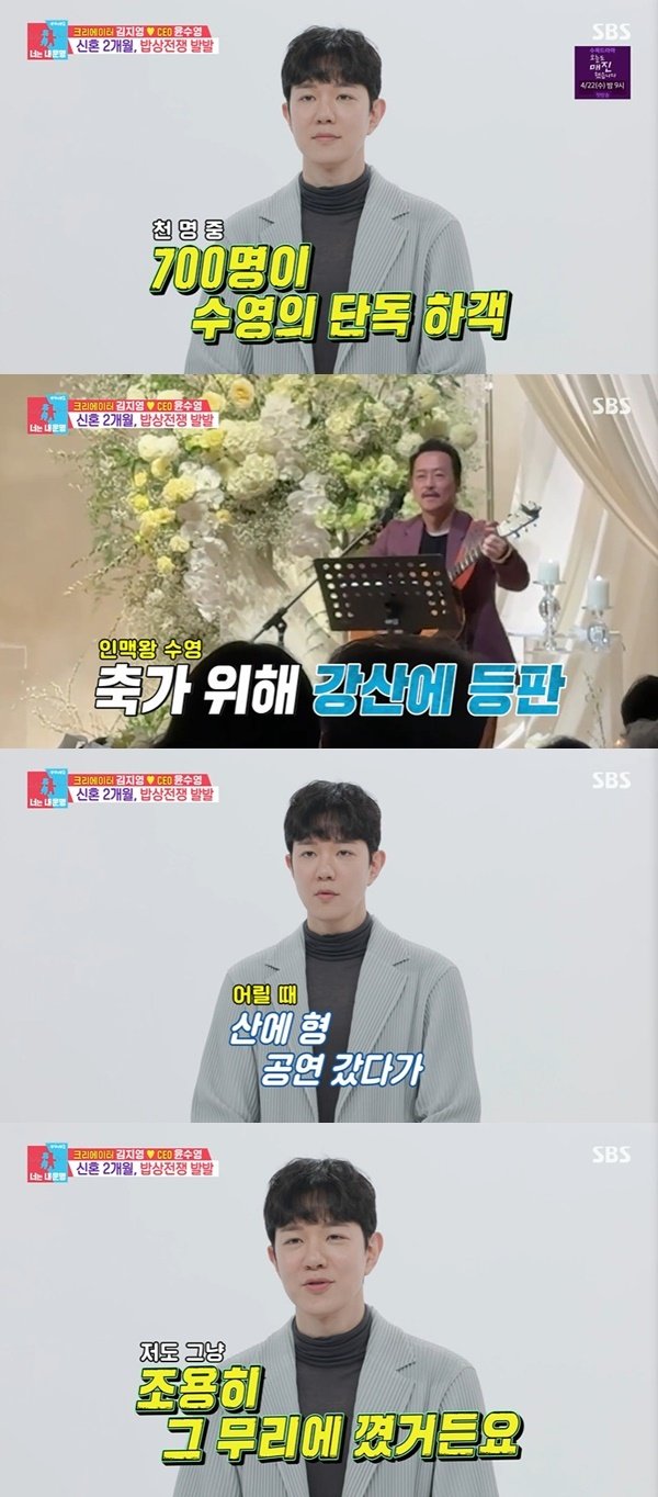 결혼식 축가는 가수 강산에가 맡았다. 윤수영은 강산에와의 인연에 대해 "어릴 때 공연을 갔다가 뒤풀이에 껴서 알게 됐다. 공연한 분들이 우르르 어디 가기에 저도 그냥 조용히 그 무리에 꼈다"고 밝혔다. 이어 "테이블에 같이 앉아서 밥 먹고 술 먹다가. 못 보던 얼굴인데 넌 누구냐. 관객이다. 그날 번호 교환을 하고 보자, 좋아한다. 처음에는 귀찮아하시다가 결국에는 친해져서 그래도 인연이 오래 이어졌다"고 말했다. 김구라는 이에 대해 "저거 쉽지 않은데"라고 감탄했다.