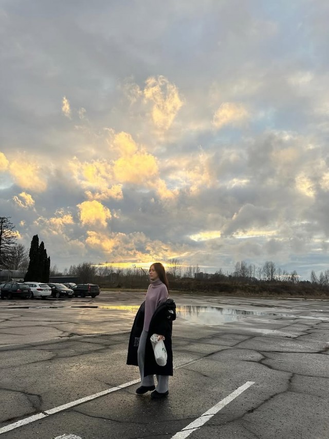 또 다른 사진에서는 신세경이 검은색 외투와 보라색 스카프를 착용한 채 주차장에서 가방을 들고 서 있는 모습을 확인할 수 있다. 구름 낀 하늘과 빗물이 고인 바닥이 배경으로, 차분하면서도 여유로운 분위기가 느껴진다.