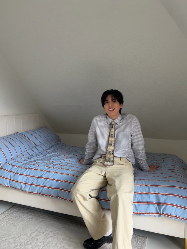 이와 함께 공개된 사진 속 홍이삭은 갈색 재킷과 체크무늬 셔츠, 베이지색 바지를 매치한 편안한 차림으로 계단에 앉아 정면을 응시하고 있다. 흰 벽과 문, 식물이 놓인 선반이 배경으로 여유로운 분위기가 느껴진다.