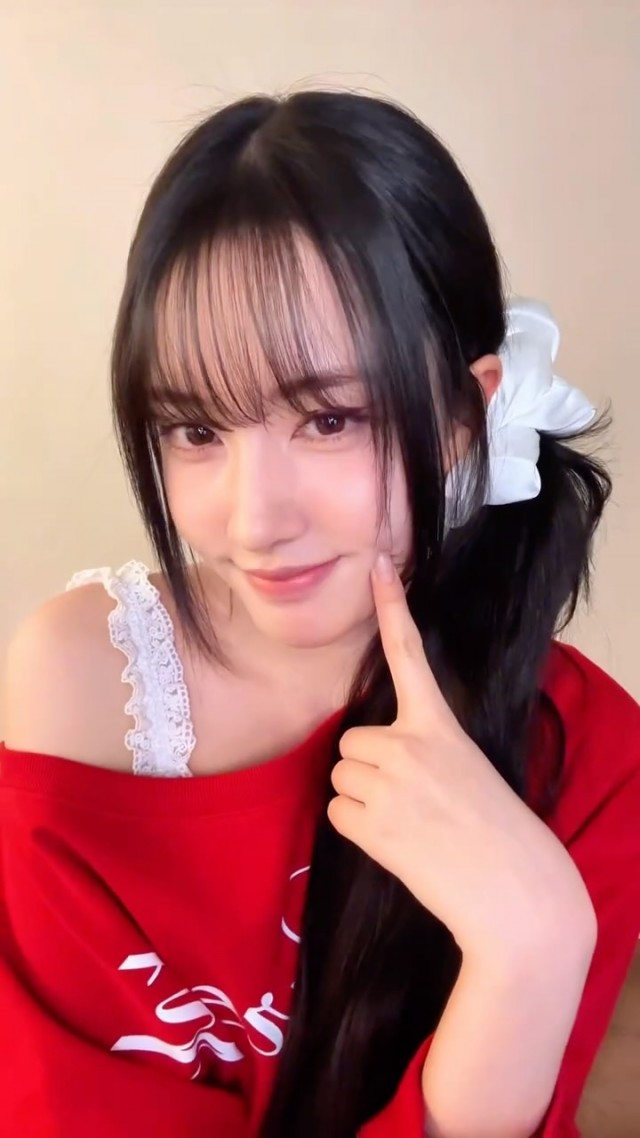 사진 속 윤은 빨간색 스웨트셔츠를 입고 한 손으로 얼굴을 가리키며 미소를 짓고 있다. 흰색 리본으로 묶은 긴 머리와 단색 배경이 어우러져 깔끔하면서도 밝은 분위기를 자아낸다. 정면을 응시하는 모습에서 팬들을 향한 따뜻한 마음과 기쁨이 느껴진다.