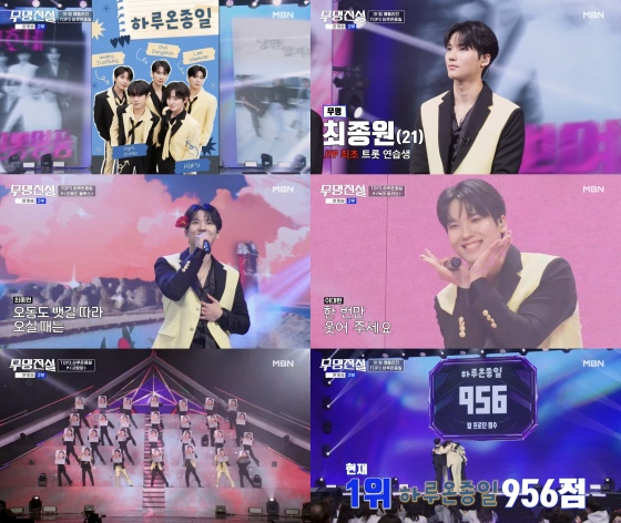 최종원이 MBN '무명전설-트롯 사내들의 서열전쟁'에서 뛰어난 무대 퍼포먼스로 주목받았다. 지난 15일 방송에서 최종원은 하루, 이대환, 황윤성, 박민수와 함께 '하루온종일' 팀을 결성해 본선 3차 '국민가요 대전' 1라운드 팀 메들리전에 출연했다.