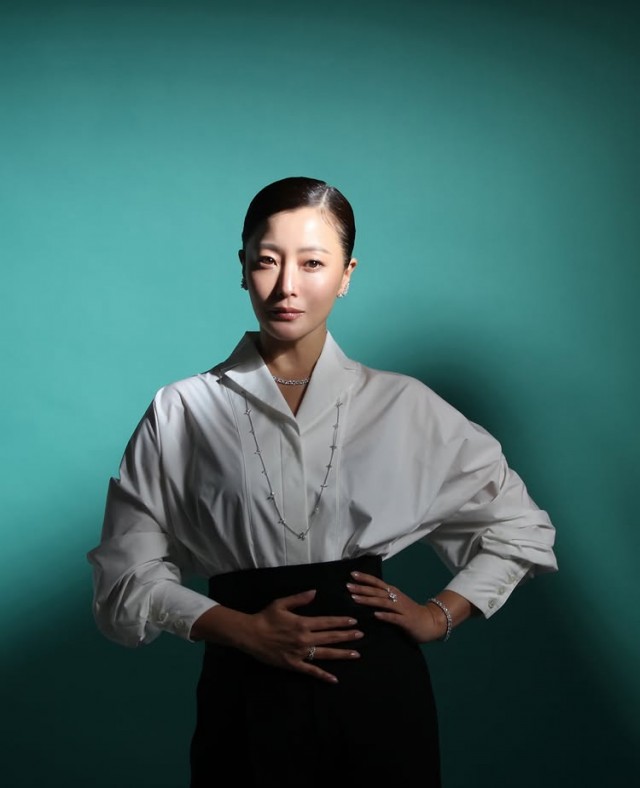 자연광이 들어오는 실내 공간에서 올리브색 셔츠와 흰색 티셔츠를 레이어드한 채 팔짱을 끼고 한쪽 어깨를 내린 모습, 흰색 블라우스와 회색 스커트를 매치하고 두 손으로 얼굴 옆에서 포즈를 취한 사진 등 다양한 스타일로 김희선만의 우아함과 세련됨을 다채롭게 보여주었다.