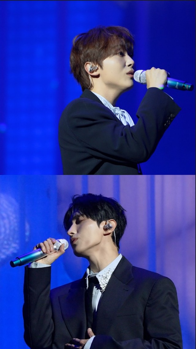 사진 속 세븐틴의 멤버 도겸과 승관은 검은색 정장과 흰색 셔츠 차림으로 무대 위에 서 있다. 두 사람은 마이크를 손에 들고 정면을 응시하며 노래에 몰입하는 모습을 보여주었으며, 조명이 비추는 무대 배경이 더욱 분위기를 고조시켰다. 특히 두 멤버의 집중한 표정과 프로페셔널한 자세가 시선을 사로잡았다.