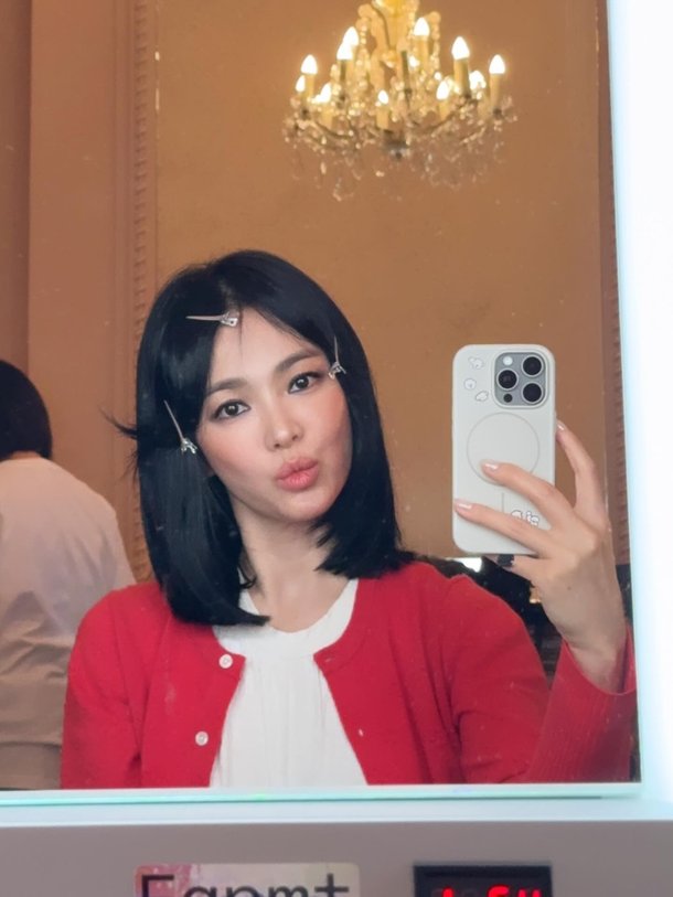 송혜교는 20일 자신의 SNS에 레드 카디건과 화이트 블라우스를 착용한 여러 장의 사진을 올렸다. 사진 속 송혜교는 메이크업 유무에 따라 다른 이미지를 보여줬다.
