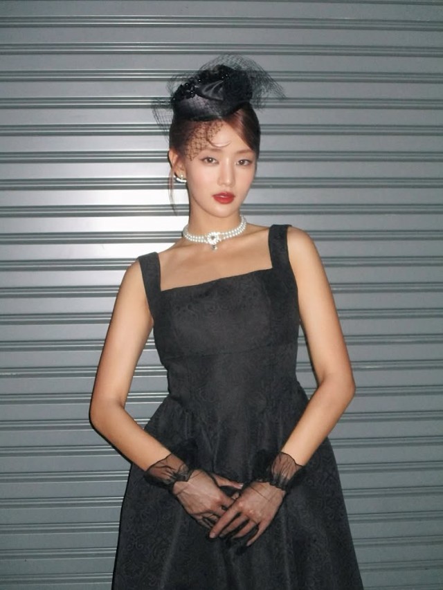 민니는 회색 줄무늬 배경 앞에서 측면을 향해 서 있거나, 한 손으로 얼굴을 가리는 장난스러운 포즈를 취하는 등 다양한 표정과 포즈를 선보이며 특유의 사랑스러운 분위기를 연출했다. 검은색 모자와 진주 목걸이, 검은색 장갑 등 고급스러운 액세서리를 매치해 우아한 스타일링을 완성했다.