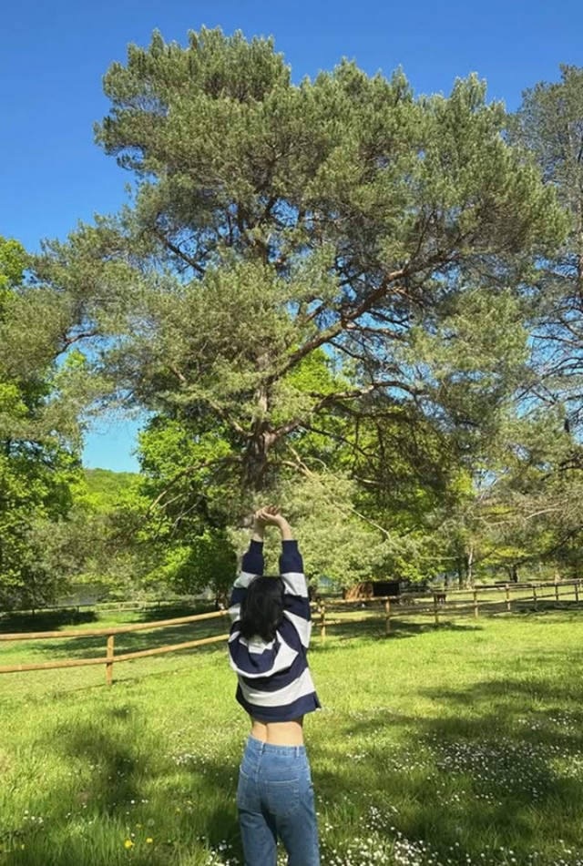 송혜교는 24일 자신의 SNS 계정에 다이아몬드, 네잎클로버 등 이모티콘과 함께 여러 장의 사진을 올렸다. 공개된 사진에는 파리의 잔디밭과 야외 테라스 등에서 여유로운 시간을 보내는 송혜교의 모습이 담겼다. 그는 네이비와 화이트 스트라이프 크롭 니트와 청바지를 매치한 캐주얼한 패션을 선보였으며, 햇살 아래 앉아 포즈를 취하거나 선글라스를 착용한 모습도 눈길을 끌었다. 특히, 뒤돌아 나무를 향해 팔을 뻗은 사진에서는 잘록한 허리 라인이 드러났다.