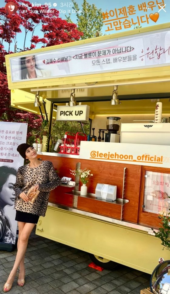 김혜수는 26일 자신의 인스타그램 스토리를 통해 이제훈이 보낸 커피차를 인증하는 사진을 공개했다. 사진에는 '촬영 힘 내주세요!'라는 이제훈의 응원 메시지 앞에서 김혜수가 감사 인사를 전하는 모습이 담겼다. 김혜수는 "이제훈 배우님 고맙습니다"라는 글과 함께 하트 이모티콘을 남겼다.
