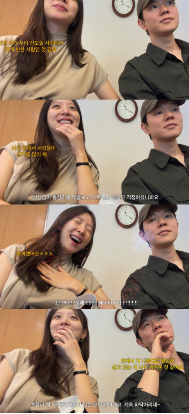 김지영은 24일 자신의 유튜브 채널에 '공포의 임당검사 전후 기록 | 임신 24주 브이로그'라는 제목의 영상을 올렸다. 영상에서 김지영은 임신성 당뇨 검사와 입체 초음파 검사를 위해 산부인과를 방문했다. 담당 의사는 김지영이 산모들 사이에서 화제가 되고 있다며, "너무 핫해서 시기를 받는 것 같기도 하다"고 말했다. 또한 의사는 김지영에게 댓글을 보지 말라고 조언했고, 이에 남편 윤수영은 "이렇게 말씀해주셔서 감사하다"고 답했다. 영상 자막에는 '선생님이 '동상이몽' 댓글을 보고 스트레스를 받을까 걱정하신 것 같다'는 설명이 덧붙여졌다.
