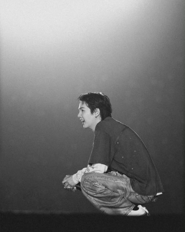 최근 공개된 사진 속에서 슈가는 검은색 재킷과 흰색 티셔츠, 검은색 바지를 입고 무대 위를 걷고 있다. 조명이 어두운 공연장을 배경으로 관객들의 조명이 반짝이는 가운데, 정면을 바라보며 집중하는 모습이 인상적이다. 이어 은색 재킷과 스트라이프 바지를 입은 모습으로 마이크를 잡고 노래하는 장면도 포착됐다. 흑백 조명 아래 펼쳐진 무대에서 한층 더 깊어진 감성으로 무대를 채운 모습이다.