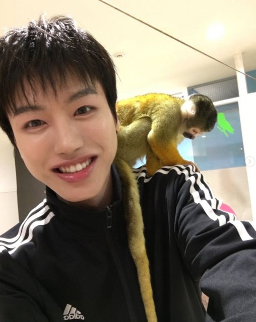 공개된 사진 속 희원은 편안한 검은색 트레이닝복 차림으로 카메라를 응시하며 환하게 웃고 있다. 특히 그의 어깨 위에는 작고 앙증맞은 원숭이 한 마리가 자연스럽게 앉아 있어 시선을 사로잡는다.