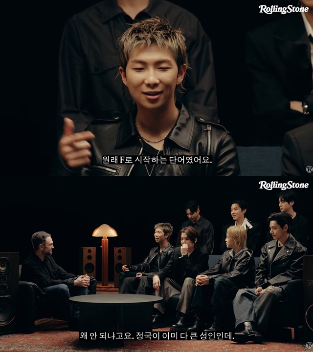 이날 인터뷰어가 "가장 막내인 정국의 솔로곡 'Seven'의 익스플리싯(19금) 버전을 처음 들었을 때 형들의 반응이 어땠나?"라고 묻자, RM은 당시 곡 작업 과정에서 있었던 소속사와의 에피소드를 털어놓았다.