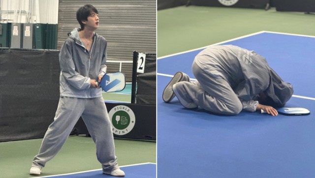 진은 28일 자신의 SNS를 통해 뷔와 함께 실내 스포츠 경기장을 방문한 사진과 영상을 올렸다. 이들은 세계적으로 인기를 끌고 있는 라켓 스포츠인 피클볼을 선택했다.