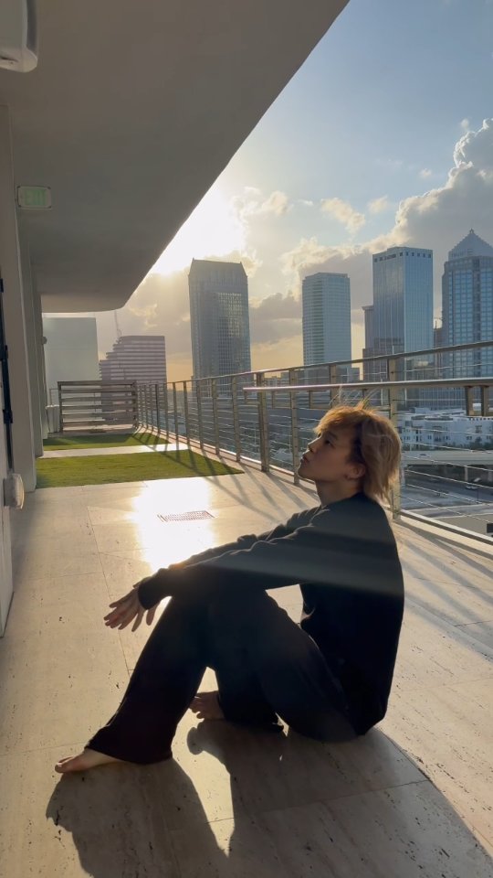 지민은 검은색 긴팔 티셔츠와 검은색 바지를 착용한 채 도시 스카이라인이 내려다보이는 발코니 바닥에 앉아 있는 사진을 공개했다. 측면을 바라보며 깊은 생각에 잠긴 듯한 표정이 인상적이며, 긴 머리와 발가락이 드러난 모습도 눈길을 끌었다.