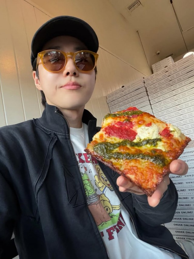 또 다른 게시물에서는 검은색 재킷과 흰 티셔츠, 선글라스를 착용한 채 피자를 들고 셀카를 찍는 모습도 공개해 다채로운 일상의 순간을 담았다. 이와 함께 와플, 샐러드, 커피, 소고기와 밥, 스시와 술 등 다양한 음식들이 함께 올라와 식사와 휴식을 즐기는 편안한 분위기를 전했다.